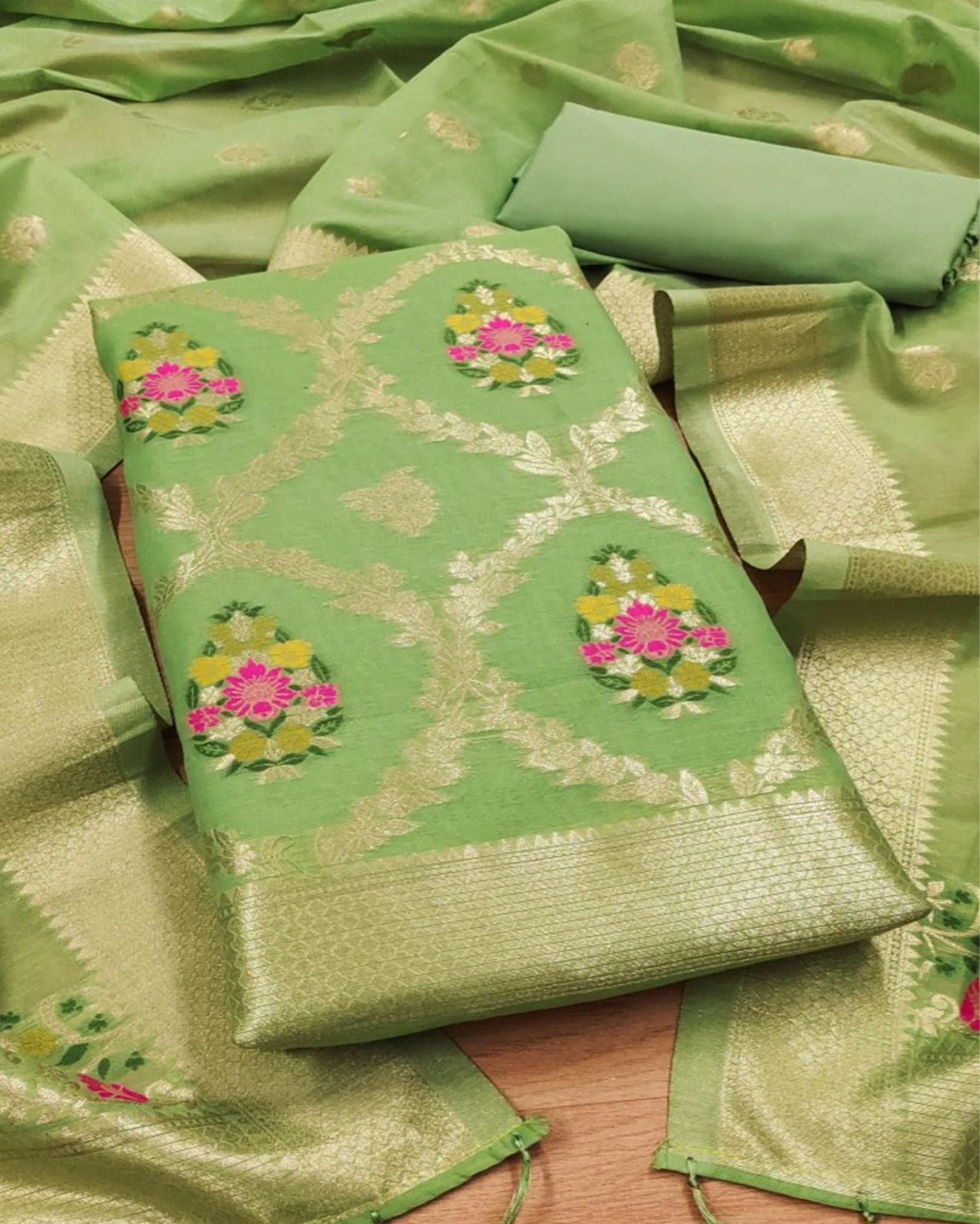 Noor-e-Banaras Cotton Brocade Green Suit