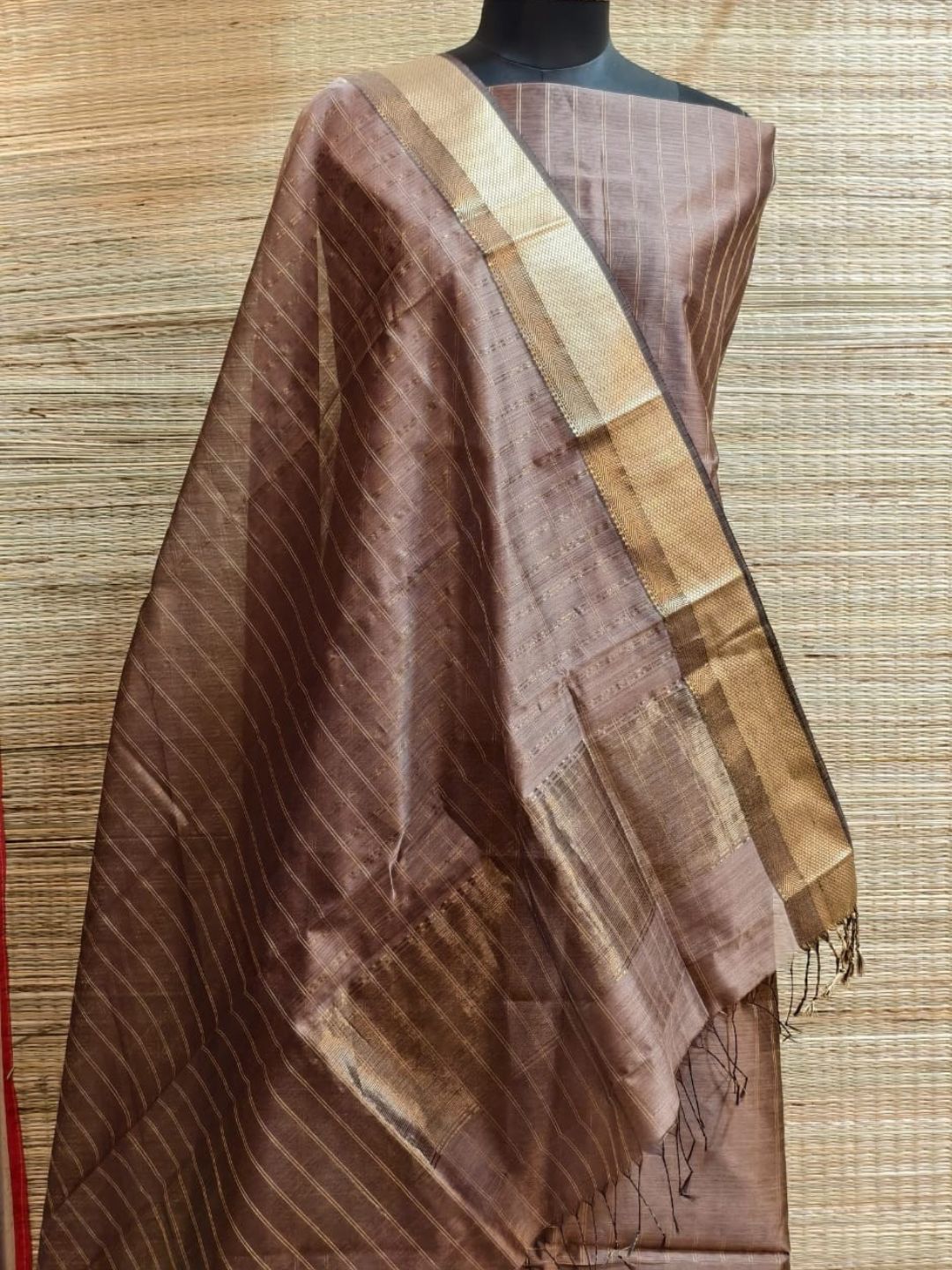 It is a traditional handloom suit made with a fine blend of cotton and silk yarns, featuring the signature Maheshwari checks pattern. The suit is enhanced with a zari and silk woven border, giving it a regal and festive look while keeping it lightweight and comfortable.