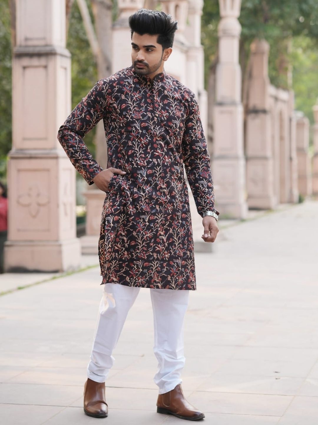 A Pure Cotton Hand Block Print Kurta & Pyjama Set is a traditional menswear set made from pure cotton fabric. Artisans hand block print motifs on the kurta using carved wooden blocks. The pyjama is stitched from matching or coordinating cotton fabric for comfort and ease.