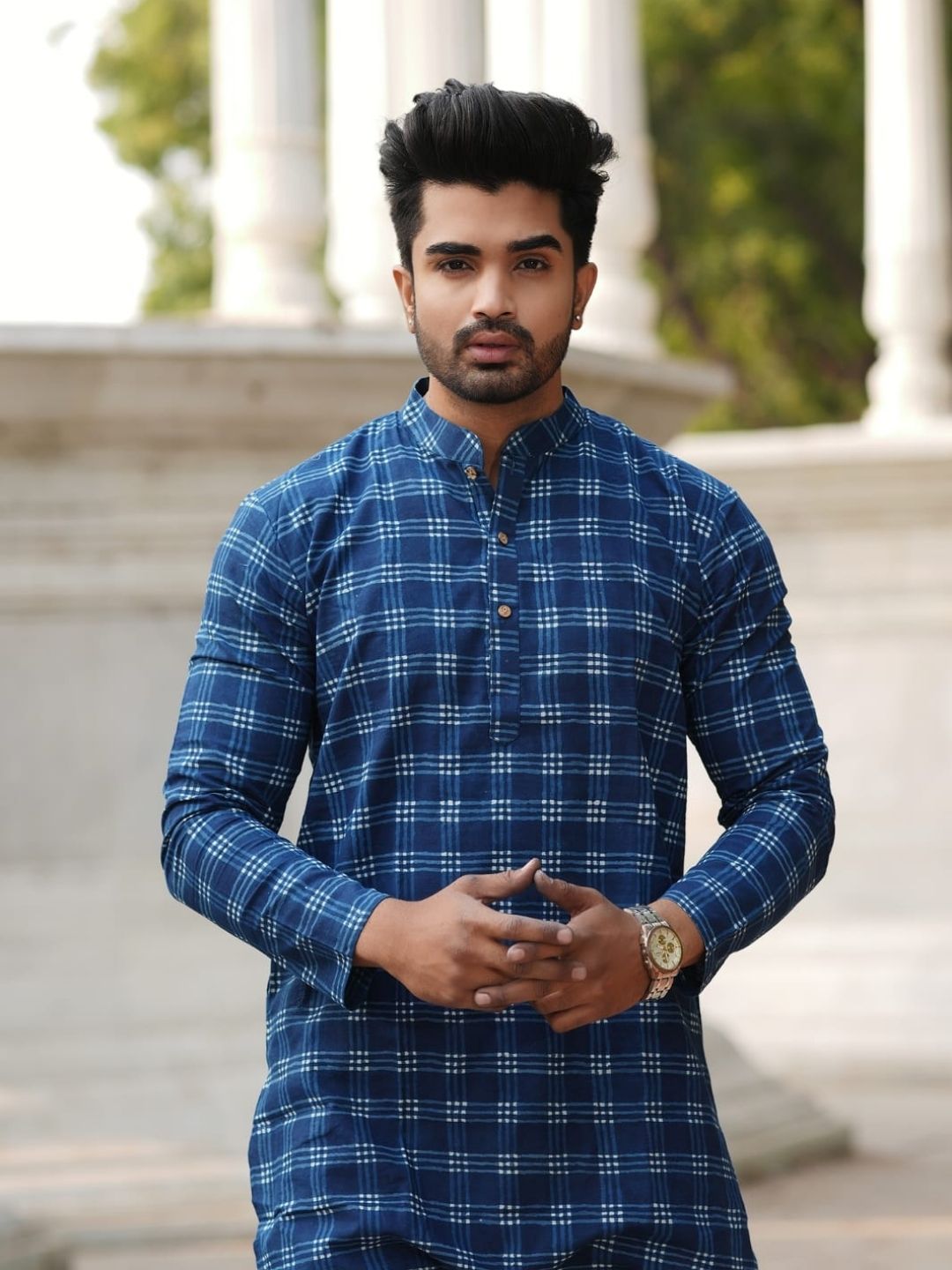 A Pure Cotton Hand Block Print Kurta & Pyjama Set is a traditional menswear set made from pure cotton fabric. Artisans hand block print motifs on the kurta using carved wooden blocks. The pyjama is stitched from matching or coordinating cotton fabric for comfort and ease.