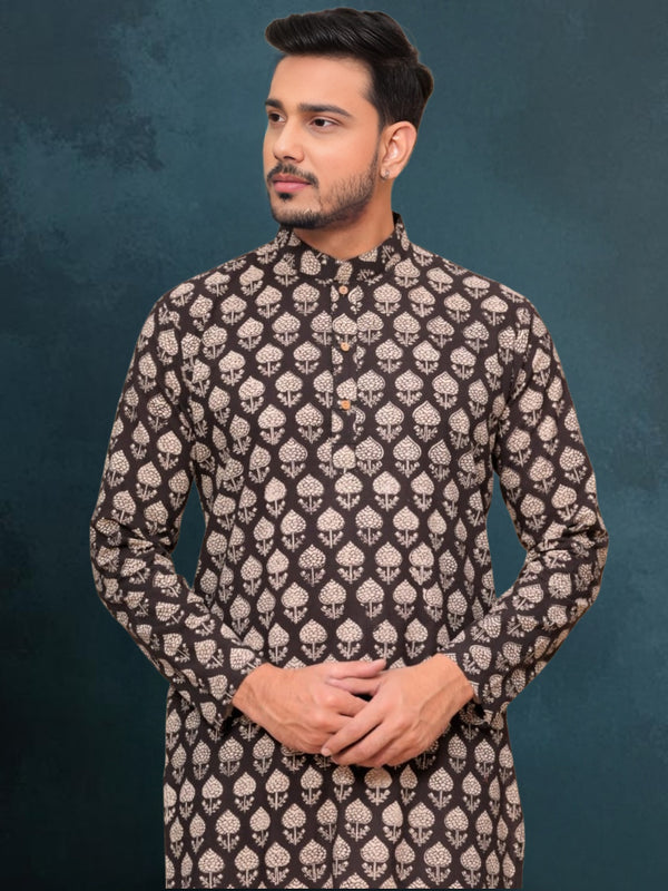 A Cotton Designer Men's Kurta Handblock Printed is a traditional Indian garment for men, crafted from cotton fabric and adorned with intricate handblock printing. It features unique patterns and designs created using wooden blocks.