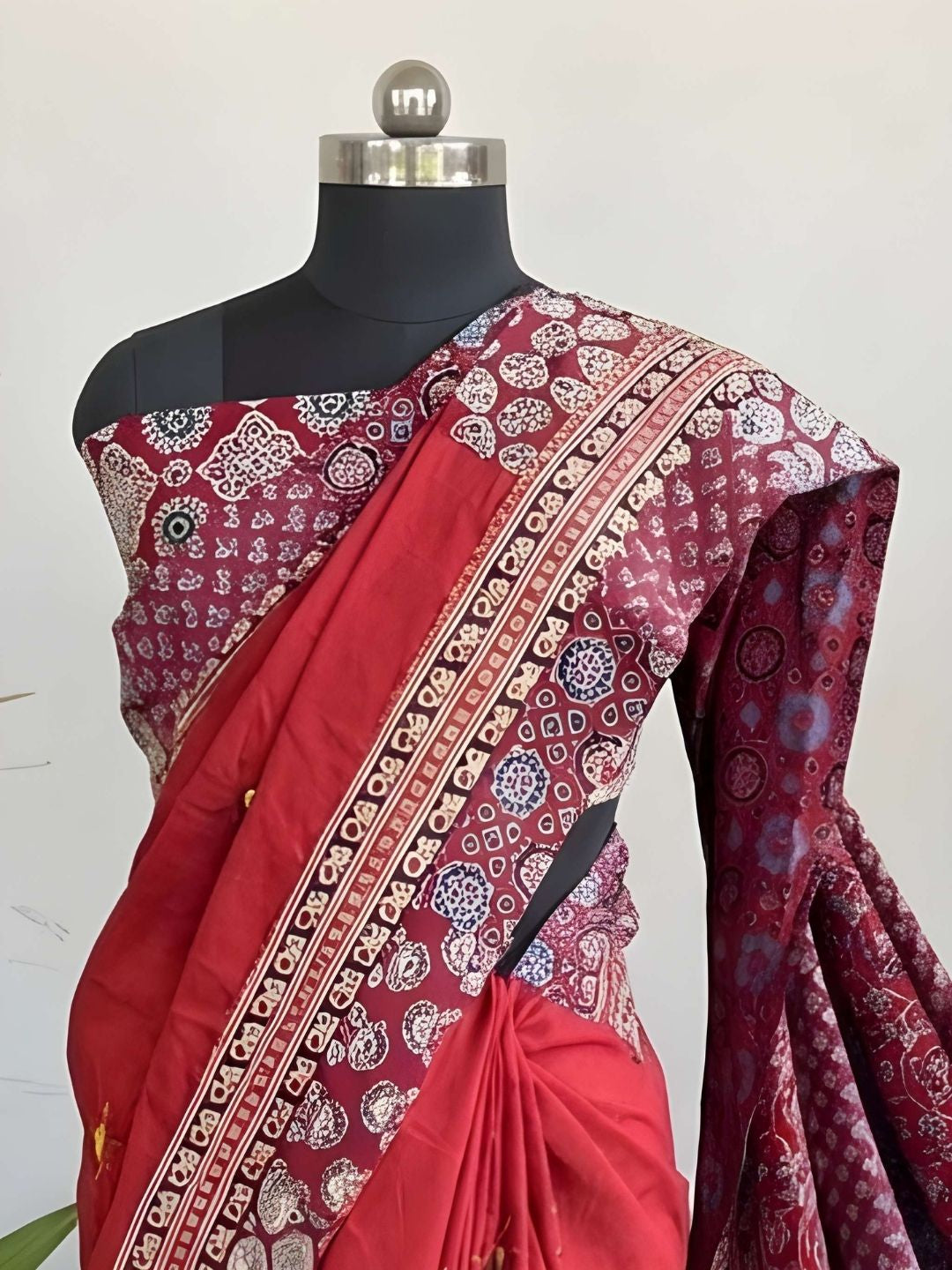 Ajrakh is an ancient hand block printing technique from Kutch, Gujarat and parts of Rajasthan. Natural dyes such as indigo and madder are used to create symmetrical, geometric, and floral patterns. The process involves multiple stages of hand printing and dyeing, making each piece unique and ecofriendly.