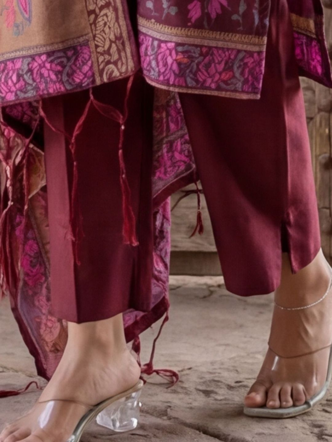 A Banarasi Silk Brocade Weaving Stitched Suit is a ready to wear ethnic outfit crafted from Banarasi silk. Skilled weavers create rich brocade patterns directly on the fabric. The suit comes pre stitched for ease and structure.