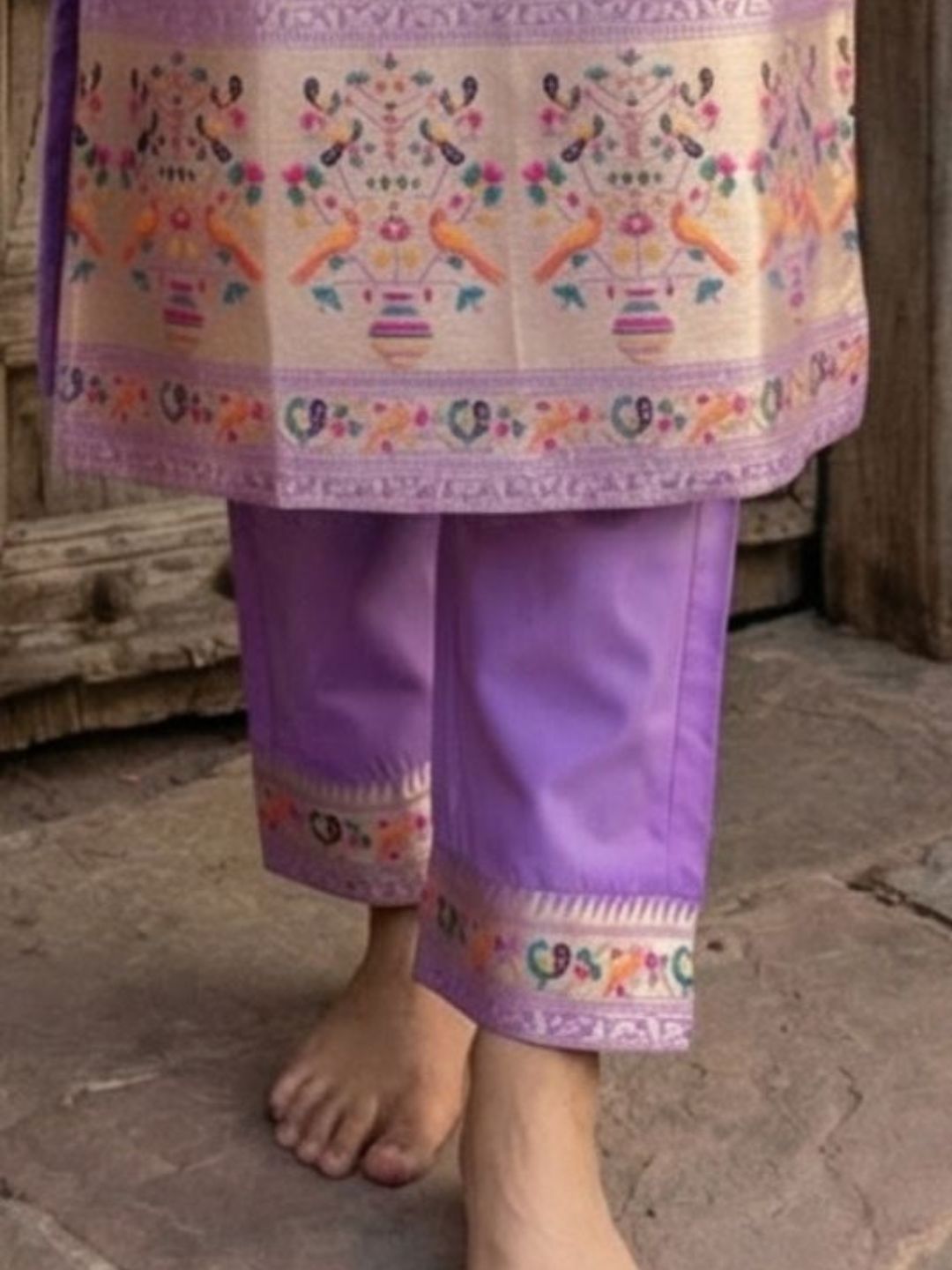 A Banarasi Silk Brocade Weaving Stitched Suit is a ready to wear ethnic outfit crafted from Banarasi silk. Skilled weavers create rich brocade patterns directly on the fabric. The suit comes pre stitched for ease and structure.