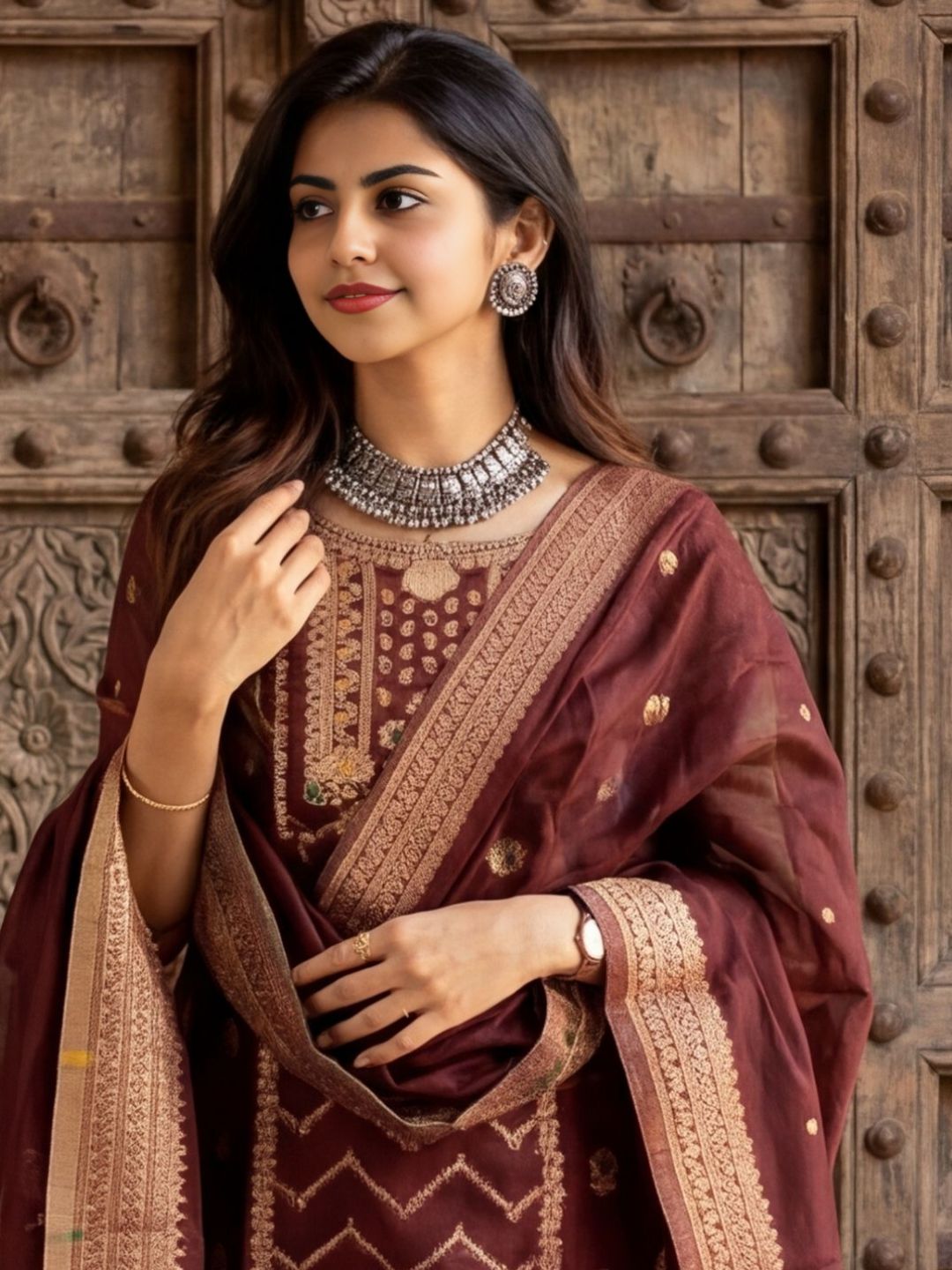Shan-e-Banaras Cotton Mix Brocade Suit Deep Brown
