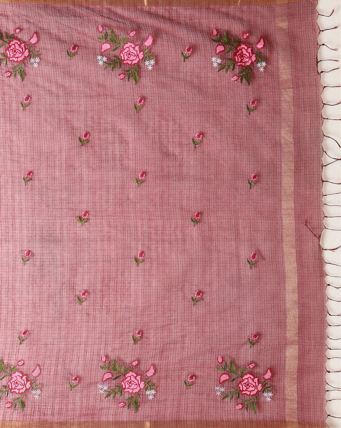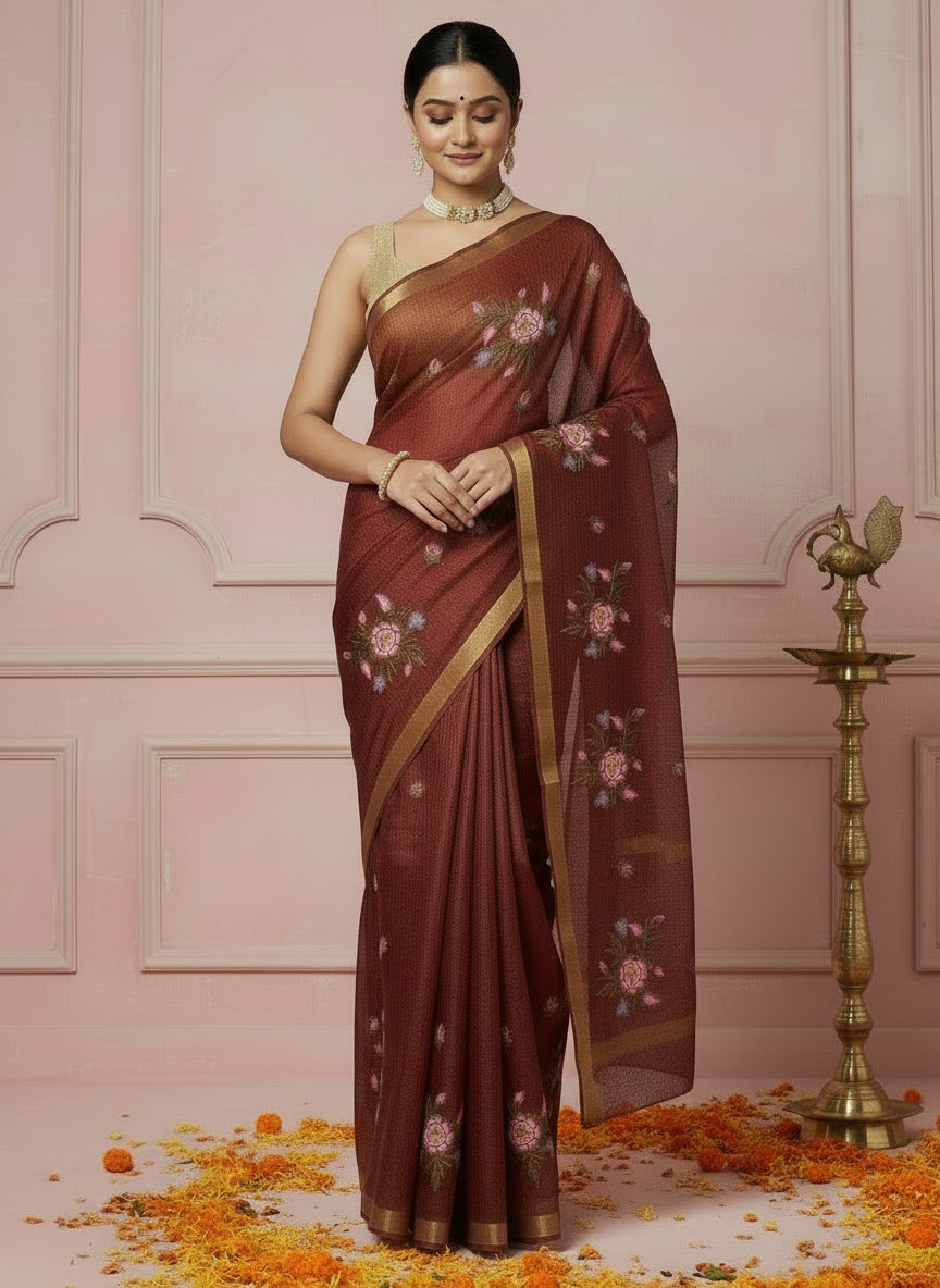 Silken Stitches Kota Silk Embroidered Saree Brown
