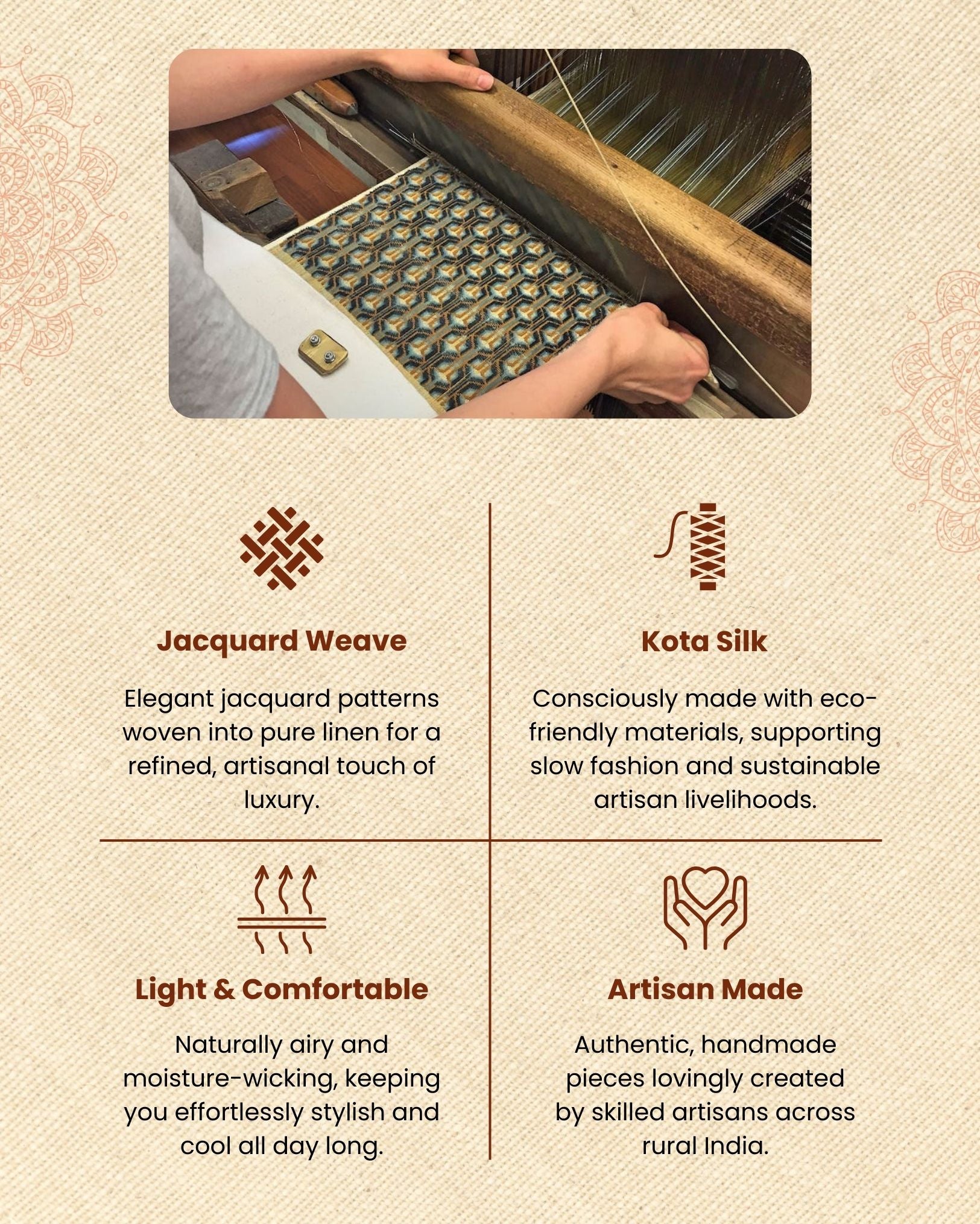 Kota Silk is a lightweight and breathable silk fabric renowned for its distinctive square-like patterns (known as "khats") and airy texture. It is traditionally woven in Kota, Rajasthan, using high-quality silk yarns.
