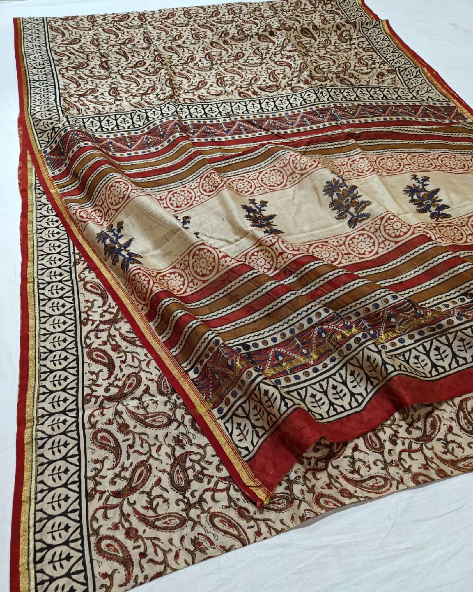This saree is made by skilled artisans who first weave the lightweight Chanderi silk and then carefully apply Kalamkari block prints using hand-carved wooden blocks. The fabric is then treated with natural dyes, making the entire process eco-friendly and artful.