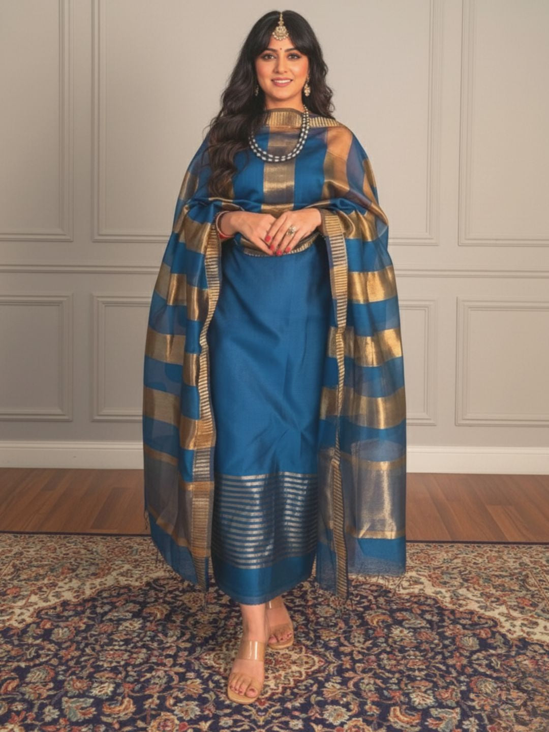 Zari Sutra Maheshwari Silk Suit Ink Blue
